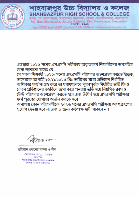 ২০২৫ সনের অকৃতকার্য এসএসসি পরীক্ষার্থীদের জন্য